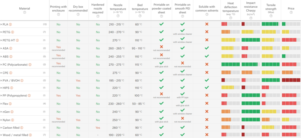 Silné stránky: vyšší houževnatost než PLA, lepší teplotní odolnost, dobrá chemická odolnost, nízký warping.